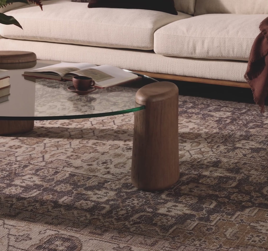 Light oak veneer and clear tempered glass craft a beautifully simple, organically shaped coffee table to anchor any space.