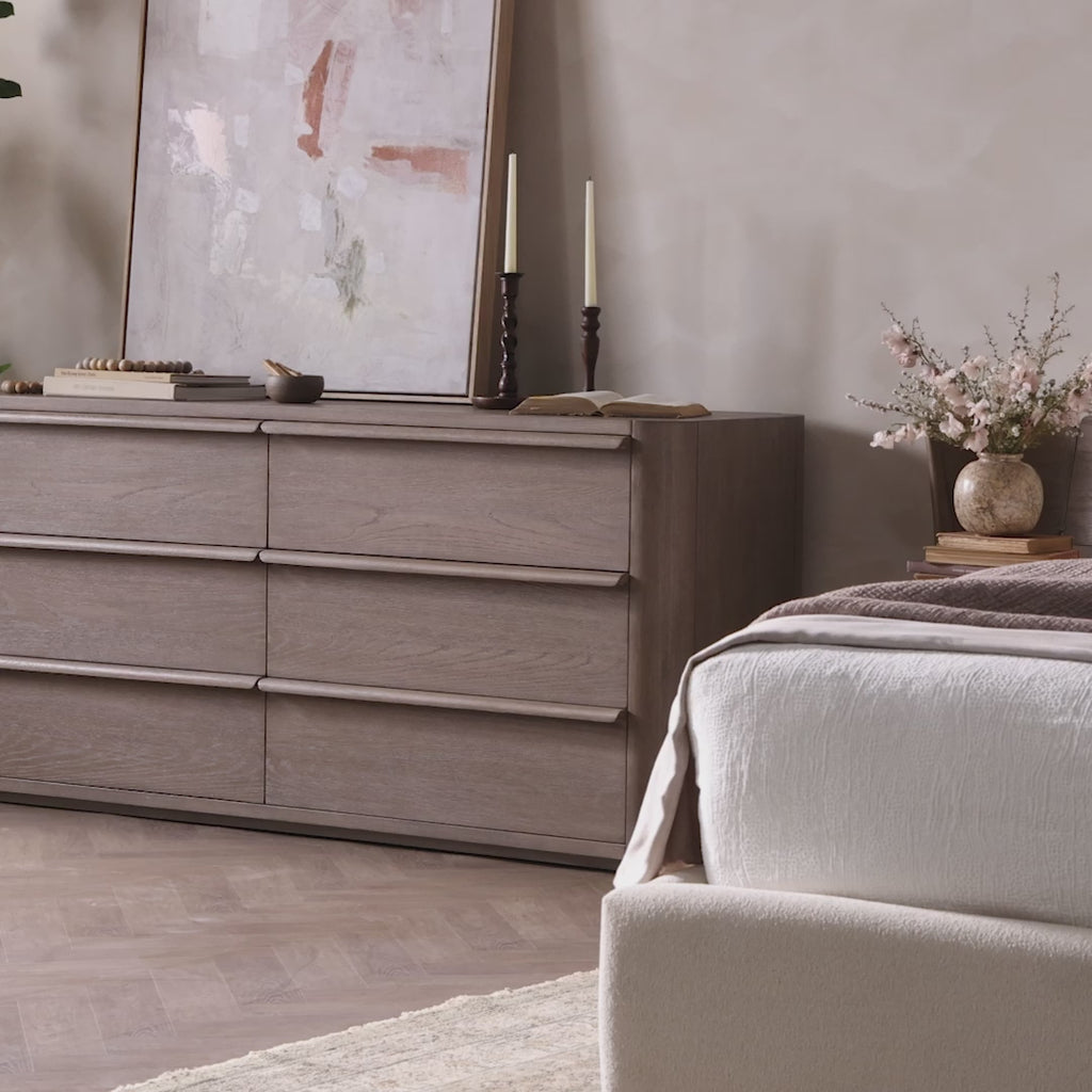 Rounded corners soften the straight edged look of this six-drawer dresser, crafted from natural oak in a warm grey finish. Wide smooth-gliding drawers are fully finished on the inside.