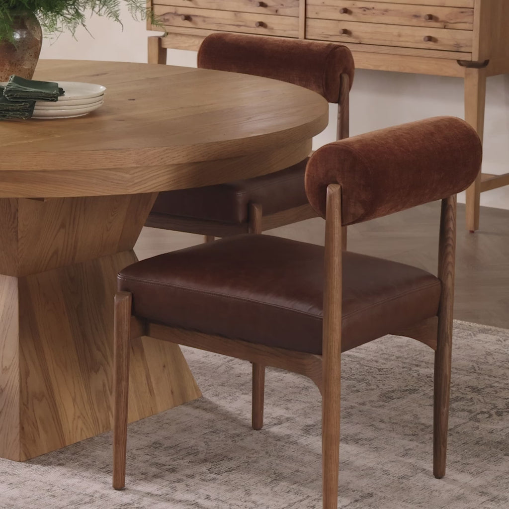 Inspired by European antiques, an extension dining table blends traditional and transitional design elements for a timeless look. A tapered, squared-off base supports a top that extends from a circle to an oval with a 20" leaf, accommodating up to 8 guests.