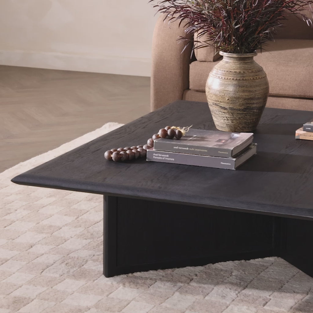 Anchor your living space with a squared coffee table of black-finished oak. A smooth top pairs with a panel-style base of woven paper cord for a rich, clean look that will work into your collection beautifully.