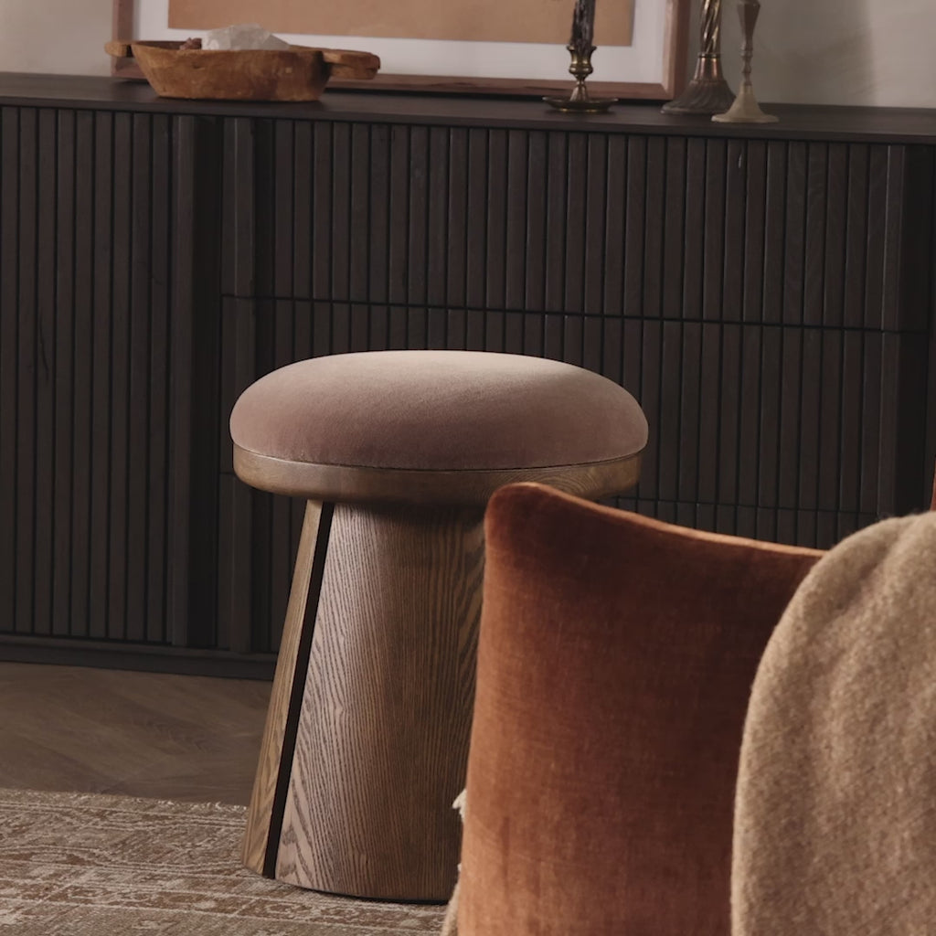 A "style anywhere" stool pairs a cone base of antiqued solid ash with a soft, velvety seat cushion. Relief cutouts add a design-forward finishing touch.