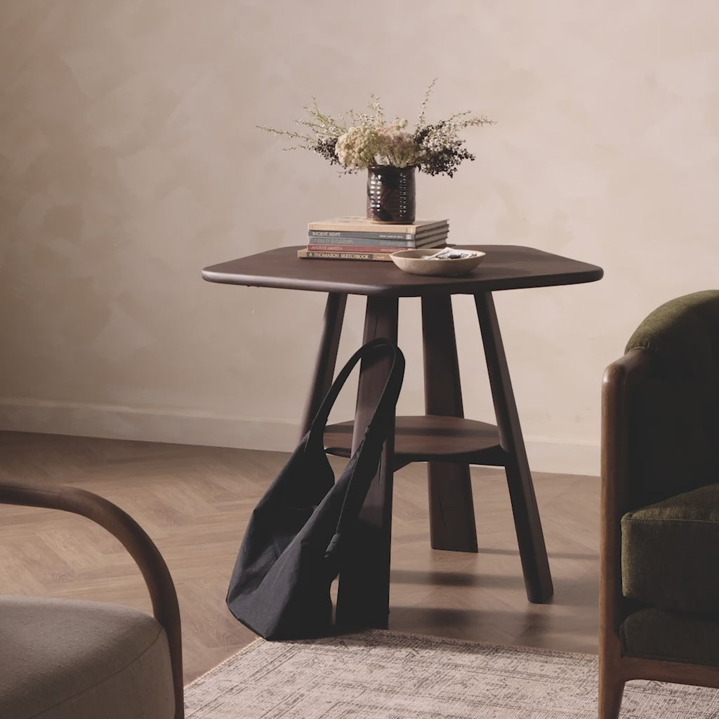 Work a handcrafted look into your space with a bench-style end table of mixed reclaimed woods. With a pentagon-shaped top and soft edging throughout, cracks and graining reflect the natural origin behind this versatile, storied piece.