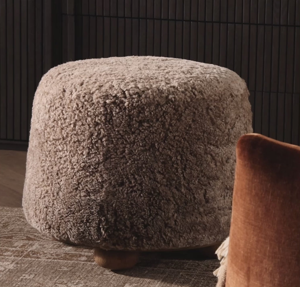Soft, sculptural, and delightfully textural—this ottoman adds a cozy touch to any corner. Upholstered in a warm taupe shearling, the rounded silhouette invites relaxed lounging while four chunky oak wood ball feet ground the look with a playful, modern edge. Whether styled solo or paired as a set, it's the perfect accent for putting your feet up or offering an extra seat.
