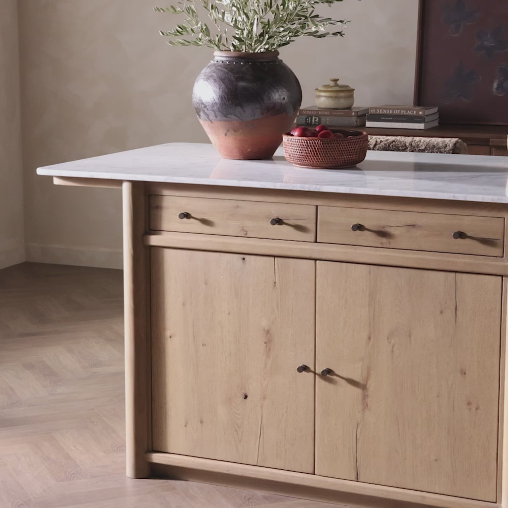 Bring bonus storage space to your kitchen with a mixed-material island of Carrara marble and aged natural oak. With closed construction to mimic a built-in piece, lower cabinetry with shelving plus dual drawers up top create endless options for storage of your servingware or appliances. Plus, it's a natural centerpoint for conversation while cooking or entertaining.