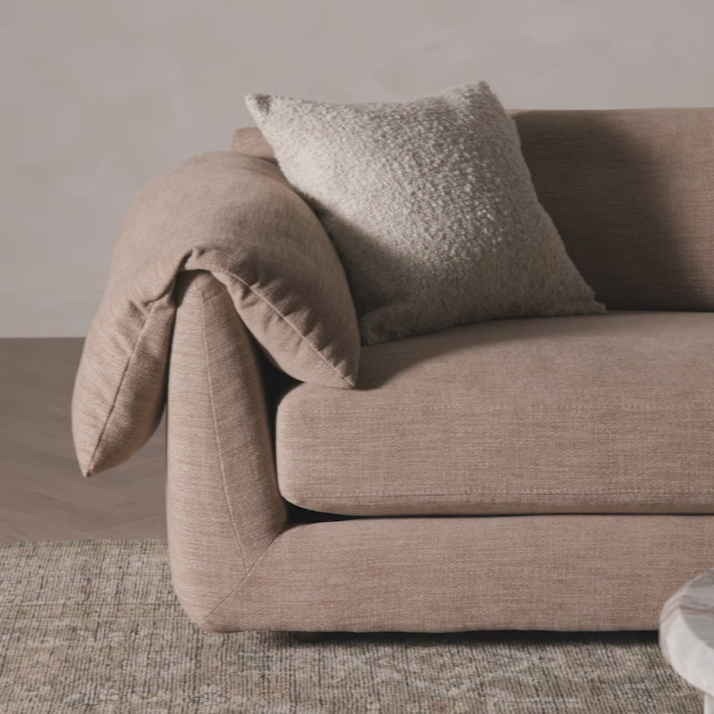 This two-over-two sofa is all about comfort. Feather-filled cushions fold over the frame, complemented by foam-fibre-feather seats. Upholstered in a taupe high-performance fabric, it balances its laid-back look with durability for every day. Performance fabrics are specially created to withstand spills, stains, high traffic and wear, ensuring long-term comfort and unmatched durability.