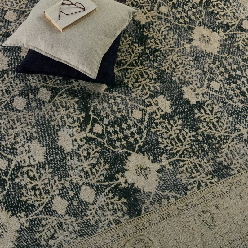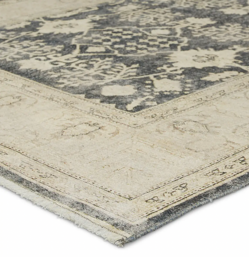 The Boheme Area Rug brings vintage inspiration to life with ornate, worldly designs and a timeless distress effect. The Boheme boasts a Persian-inspired center medallion, short fringe and detail-rich border in a navy, cream, gray, and pastel green colorway. This zero-pile rug is printed on cotton, polyester, and soft chenille for a flat, durable finish. Perfect for high and low-trafficked areas of the home, this rug delights in bedrooms, halls, living areas, dining rooms, and entryways.