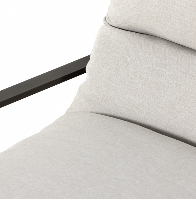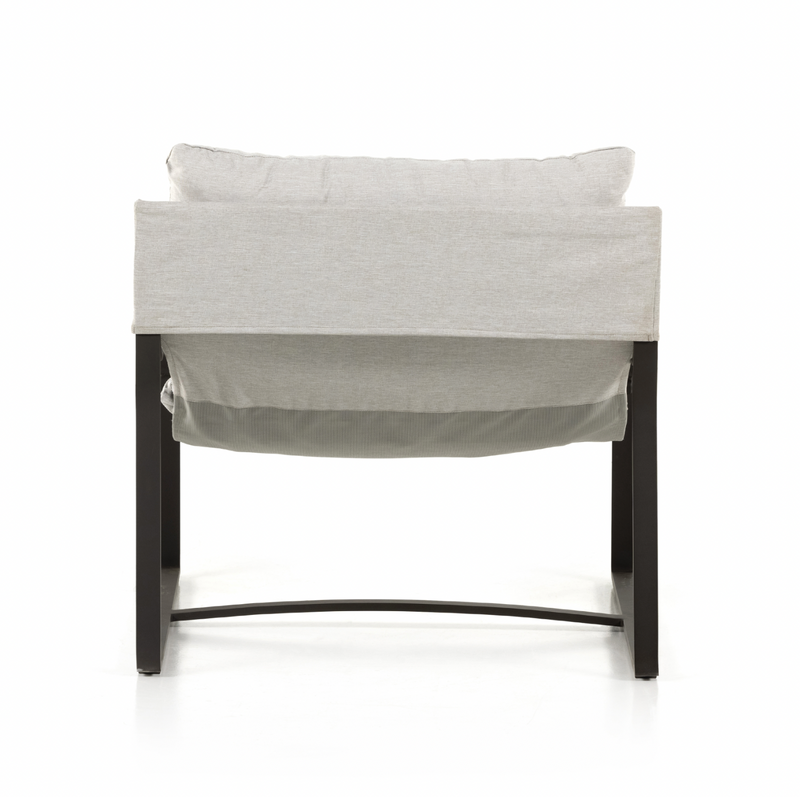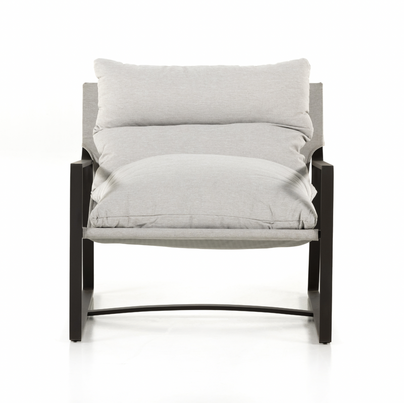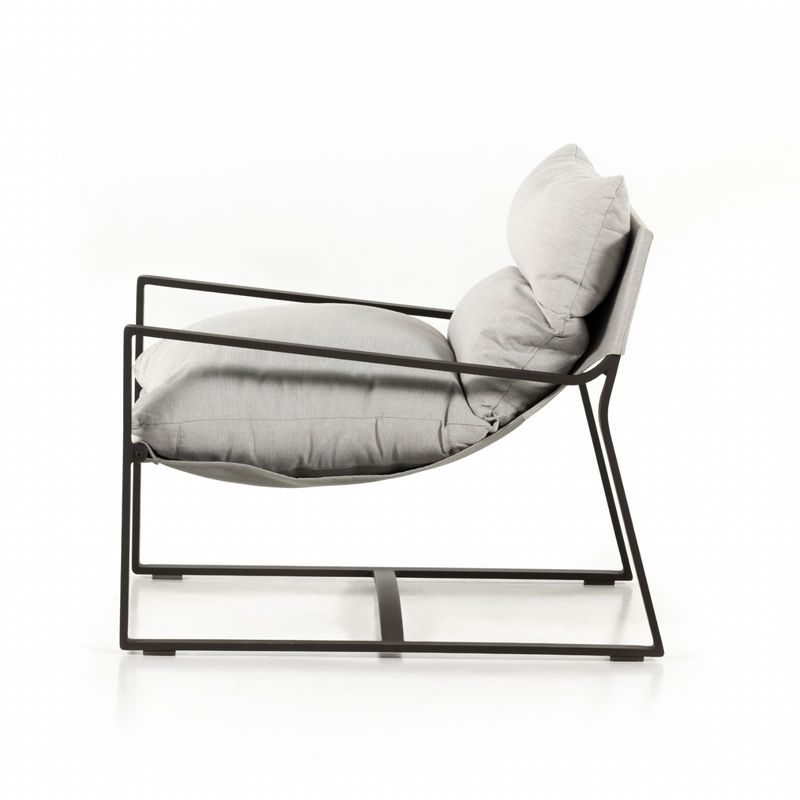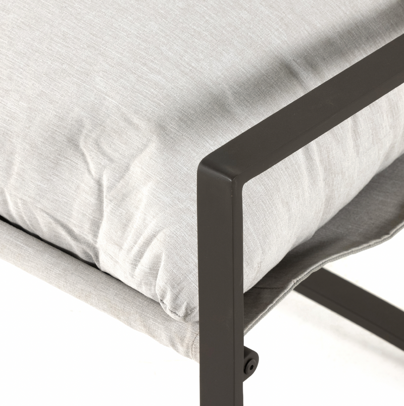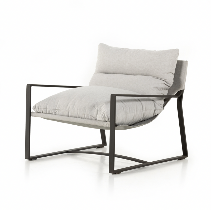 An innately hip design, modernized for outdoor use. Sling-style seating sits low and curved, with a removable cushion for cleaning ease. Bronze-finished aluminum framing adds an angular touch. Cover or store indoors during inclement weather and when not in use.