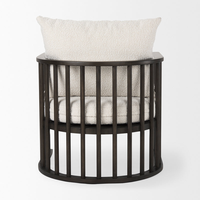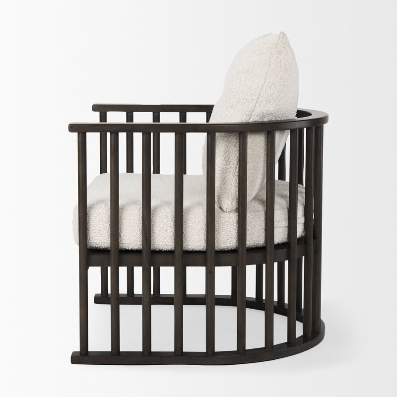 Perfect for the contemporary home or office, the Bianca accent chair stylishly combines bouclé fabric with solid wood. Here, the indulgent texture of a creamy bouclé fabric perfectly contrasts the rich, dark brown, wooden legs and frame. Expect an oh-so-comfy cushioned seat and backing enveloped in a strong (yet elegant) barred and arched frame.