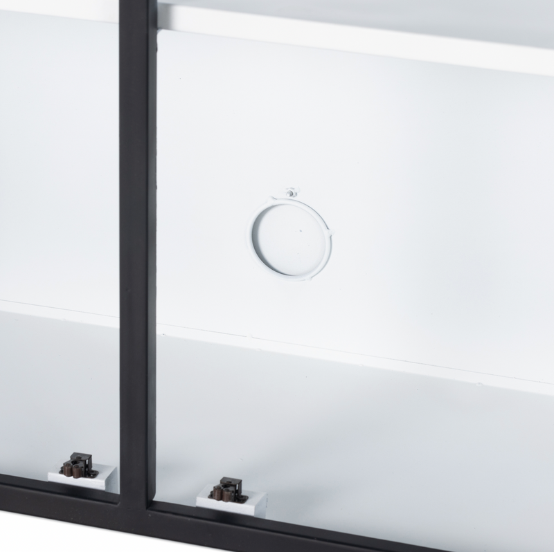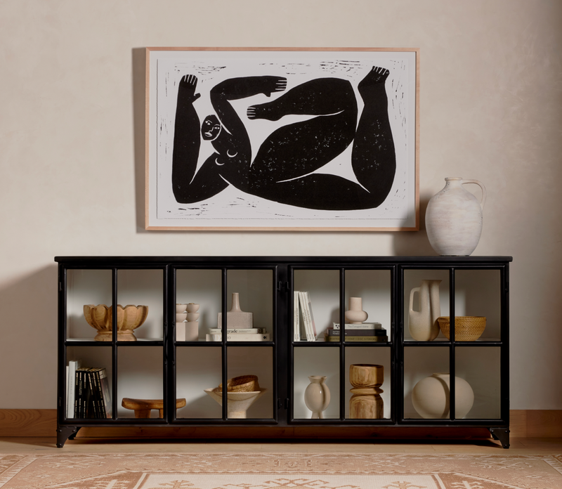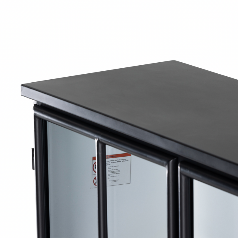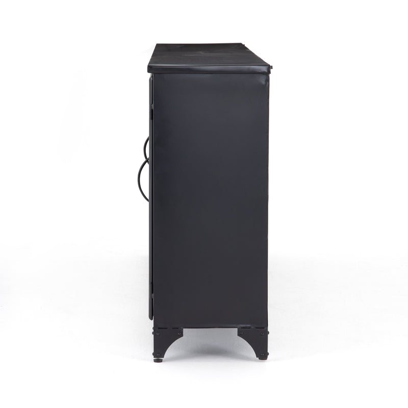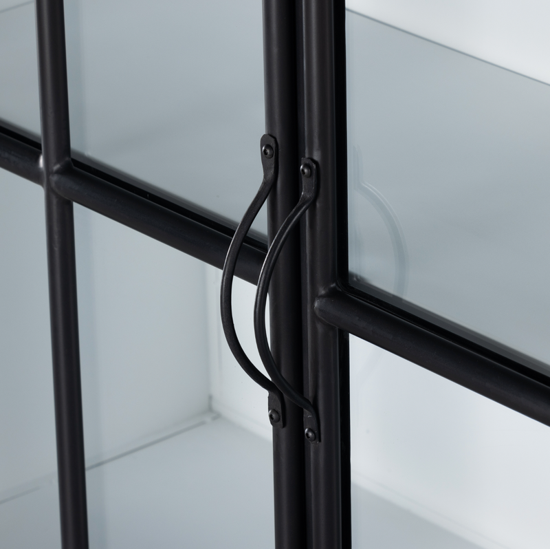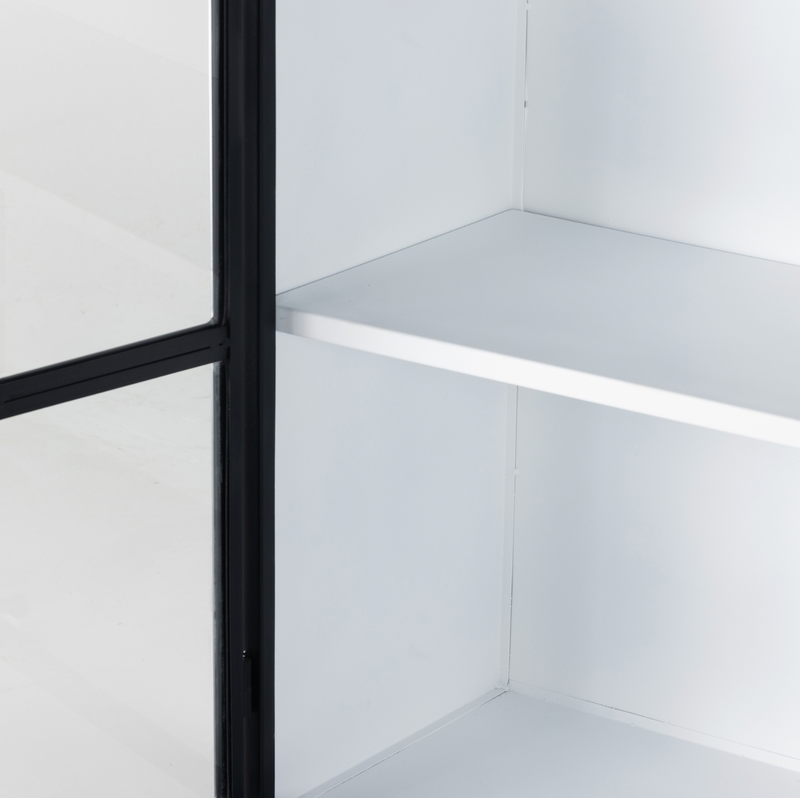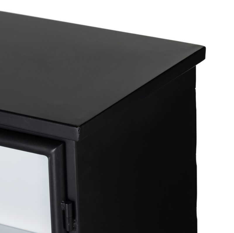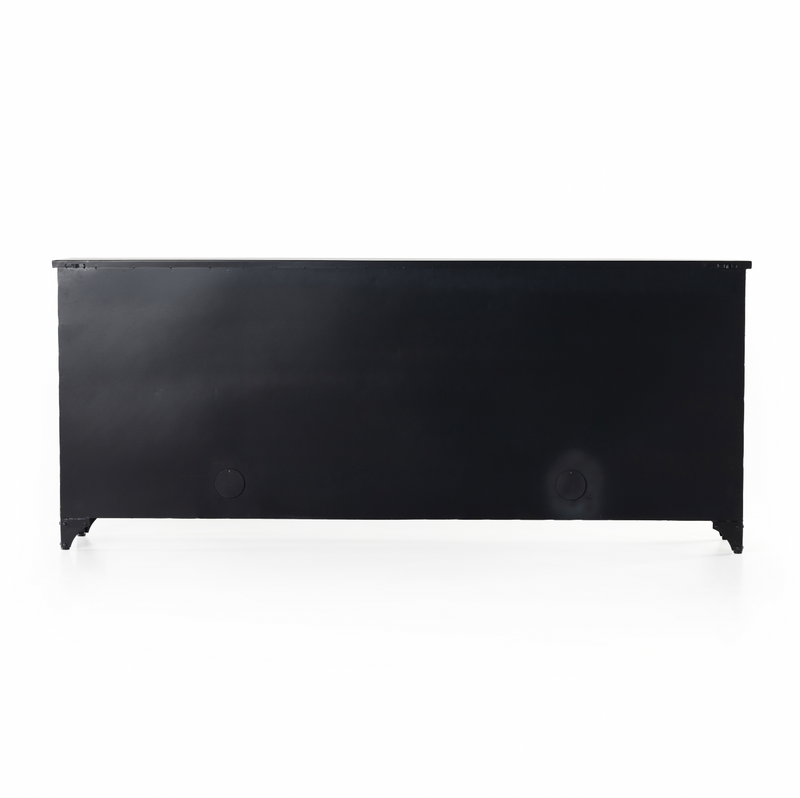 A distressed black iron frame contrasts a clean white interior for an updated take on the traditional media console. Windowpane doors and ample interior shelving maximize storage and display options. Variation from piece to piece is to be expected and speaks to the natural allure of industrial iron.