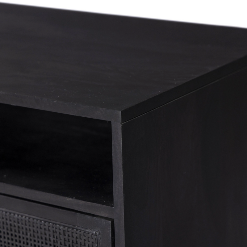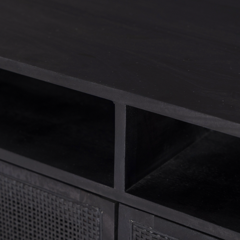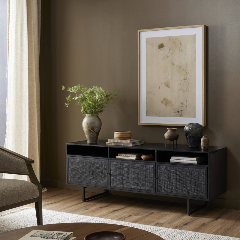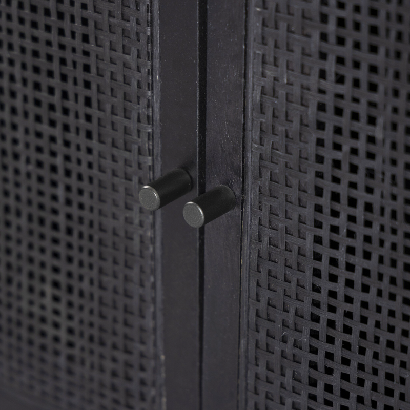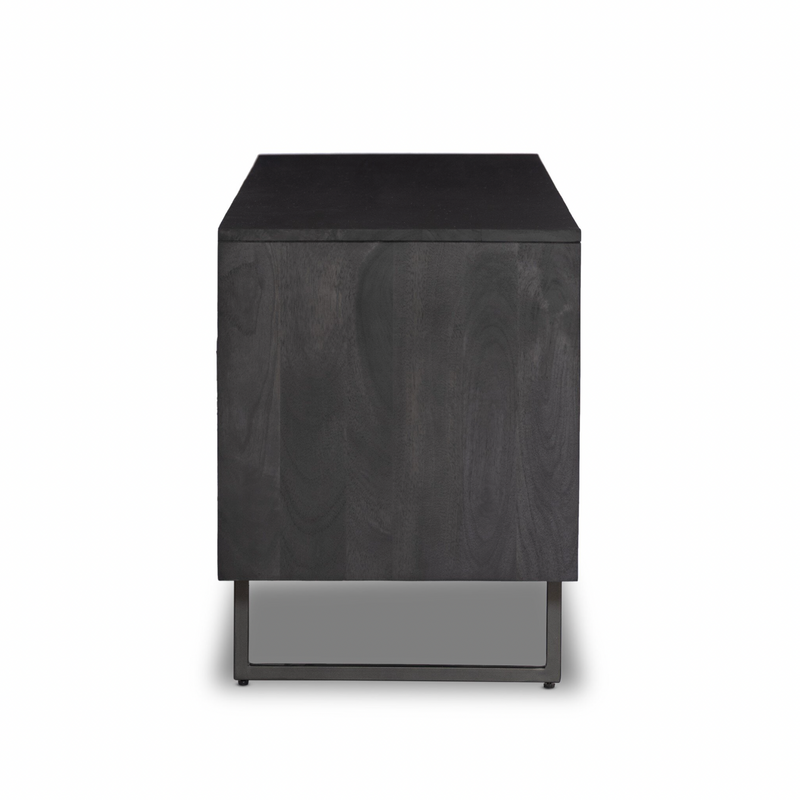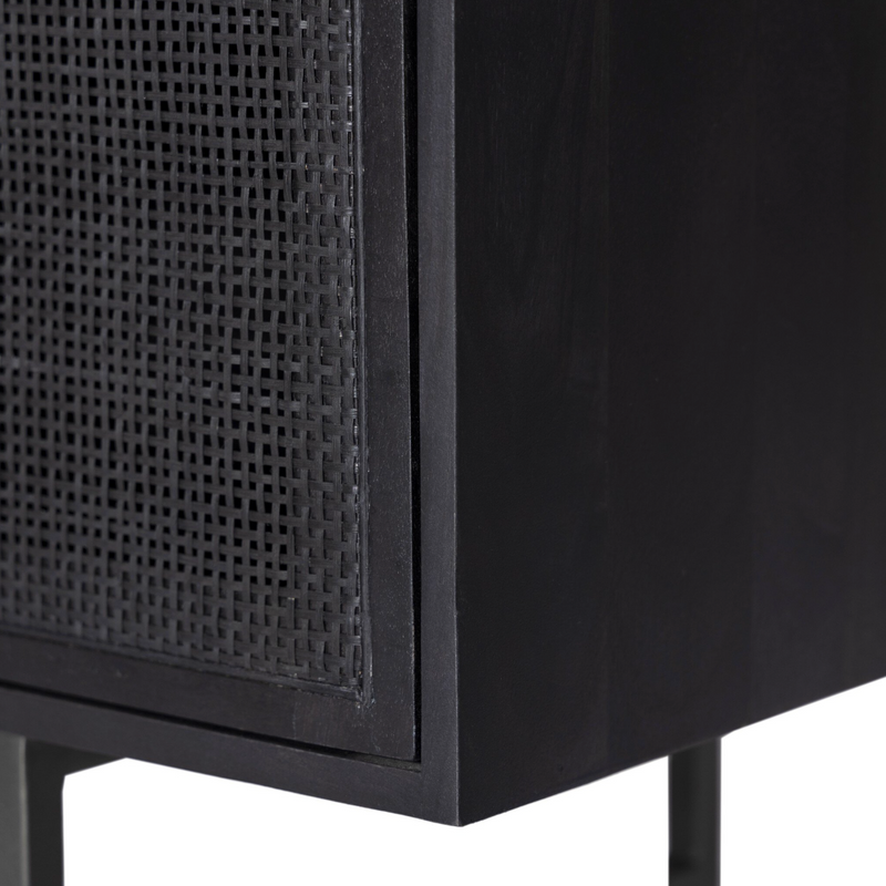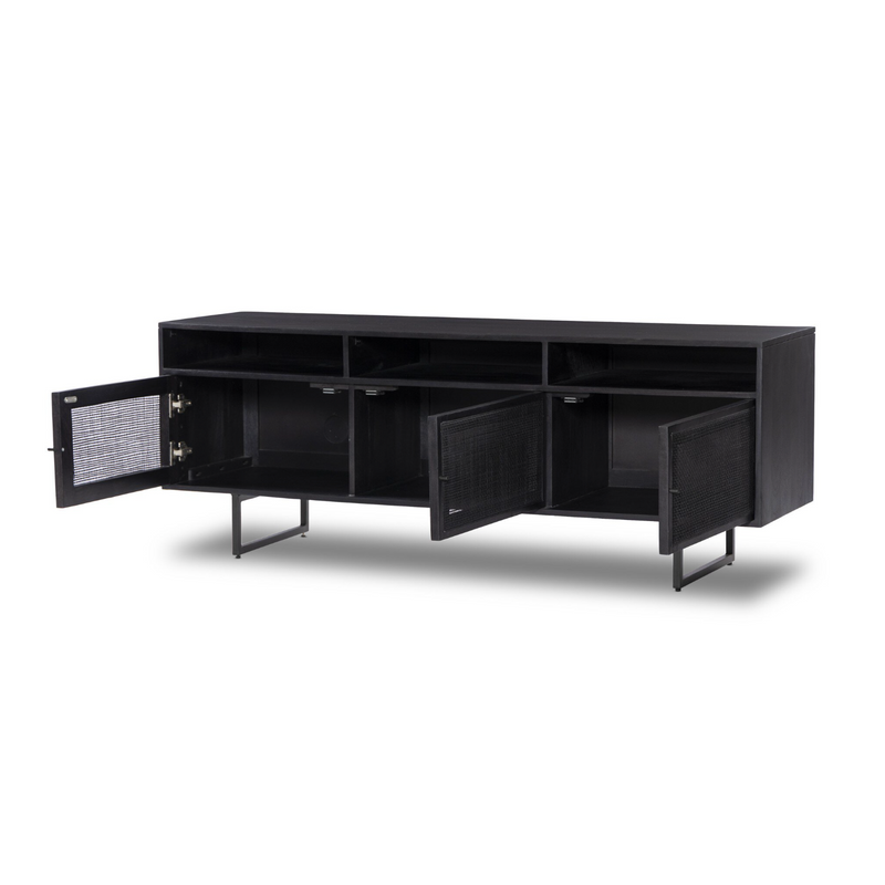 Surrounded by solid mango casing, black cane door fronts place a textural twist on midcentury-inspired styling. Airy and angular, charcoal-finished iron legs bring just-right balance to the whole look.
