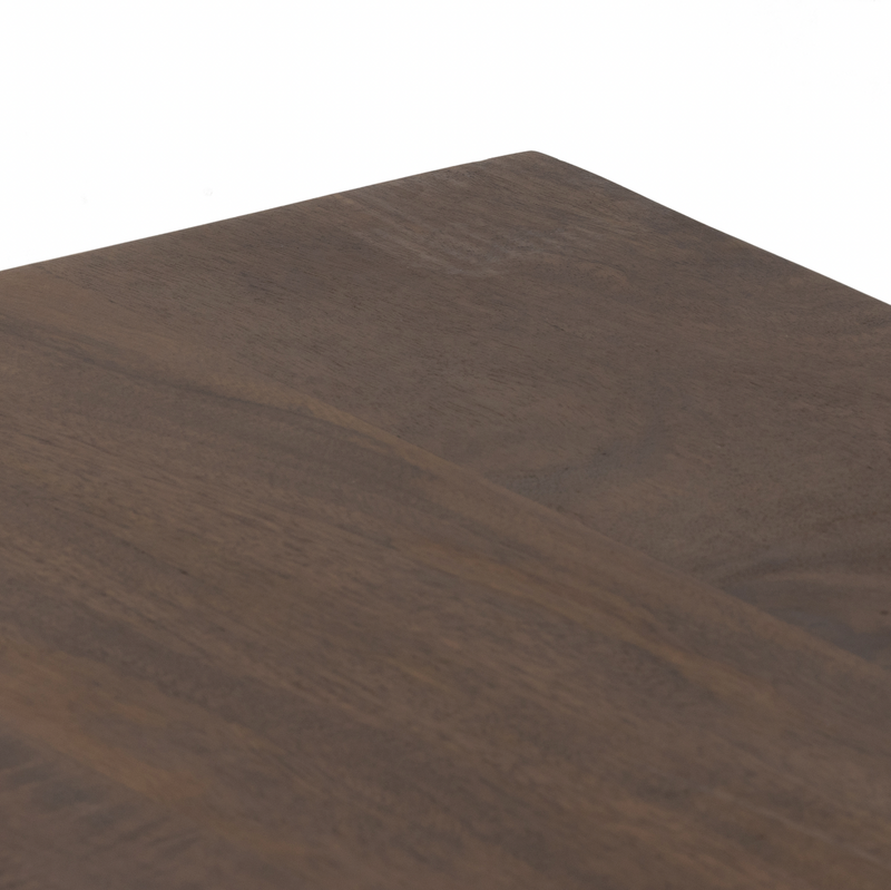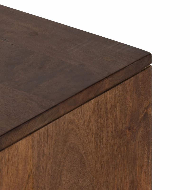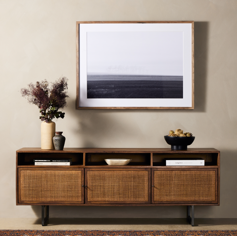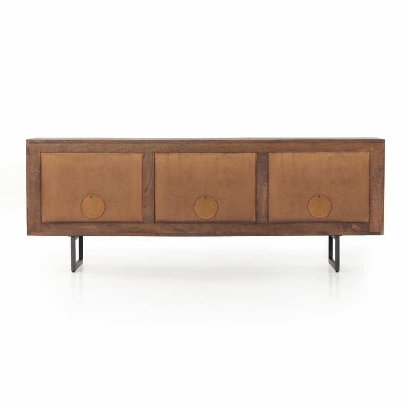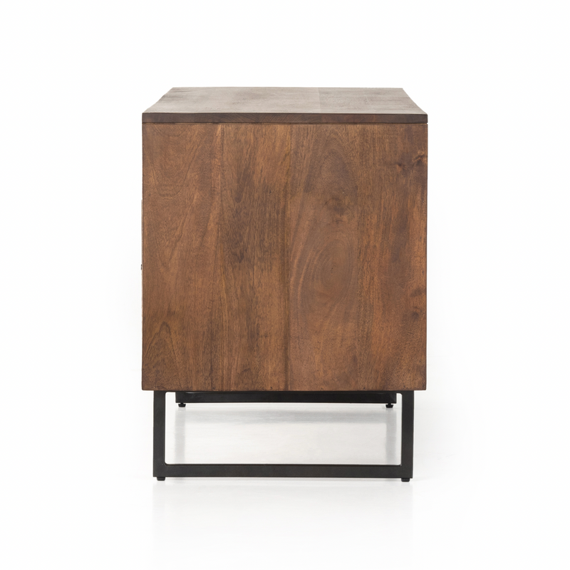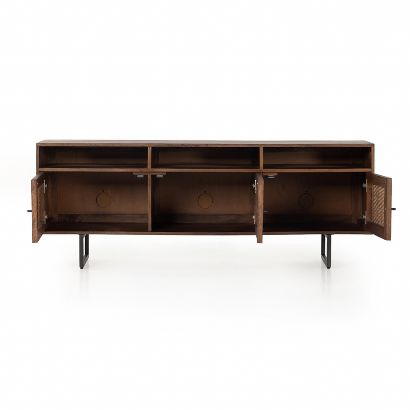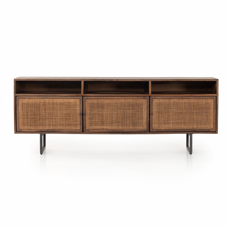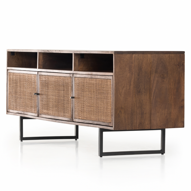 Midcentury-inspired style with an organic twist. Surrounded by brown-washed solid mango casing, cane door fronts weave for a look of great depth. Angular iron legs offer an intriguing contrast of texture and tone. Shelving and posterior cord management for modern media storage. Explore the full collection.