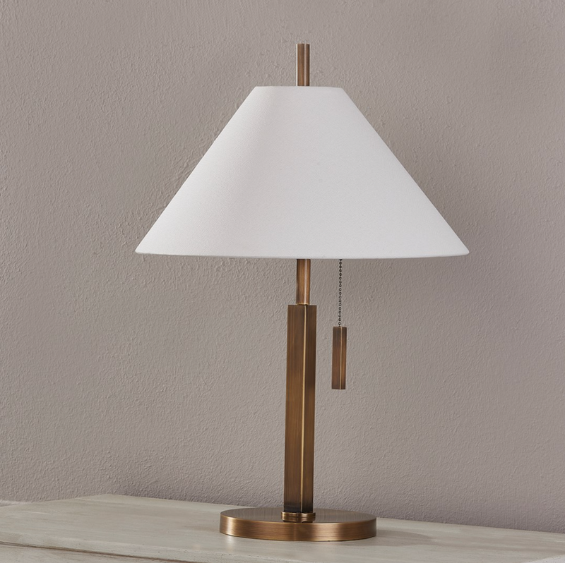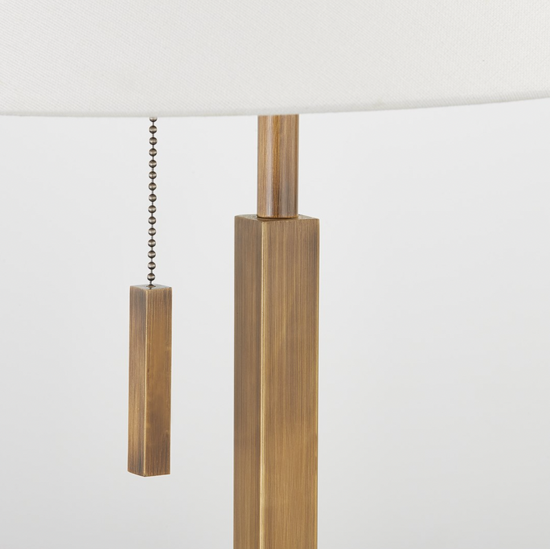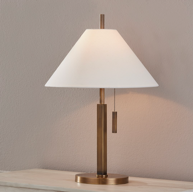 Emilio is classic and tailored. An extruded square body set atop a circular base extends into a slim pole that pierces through a tapered, off-white linen shade to create a layering of simple geometry. The pull chain adds a stylish and functional detail, while the all-over patina brass finish contributes to the sophistication of this collection. Emilio is also available as a floor lamp.