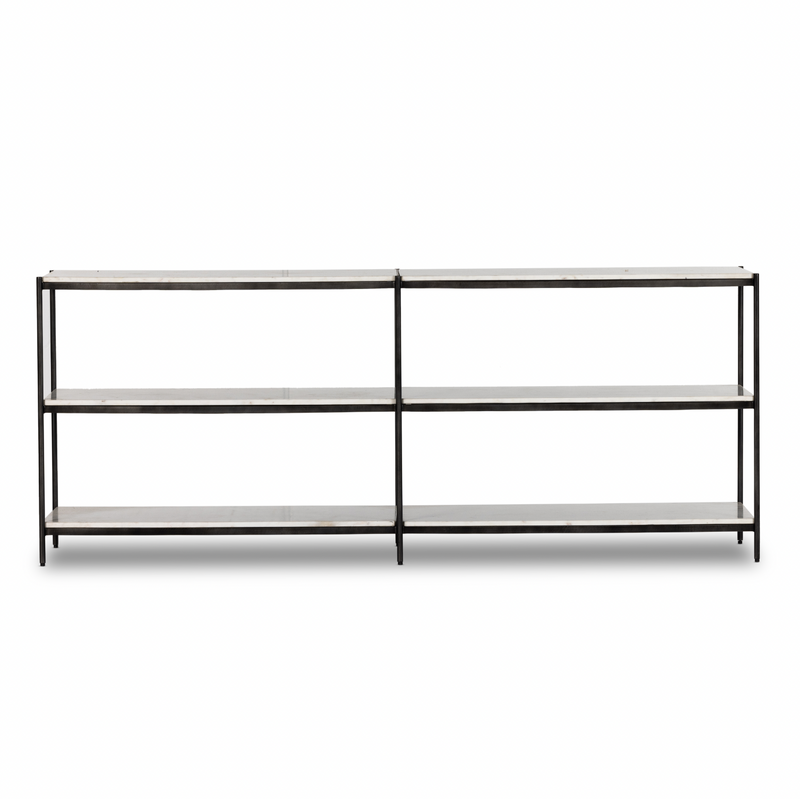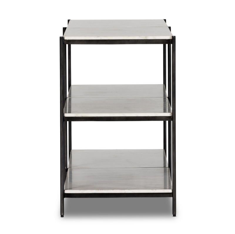 Hammered grey-finished iron frames three tiers of polished white marble, for an open look with plenty of surface space.