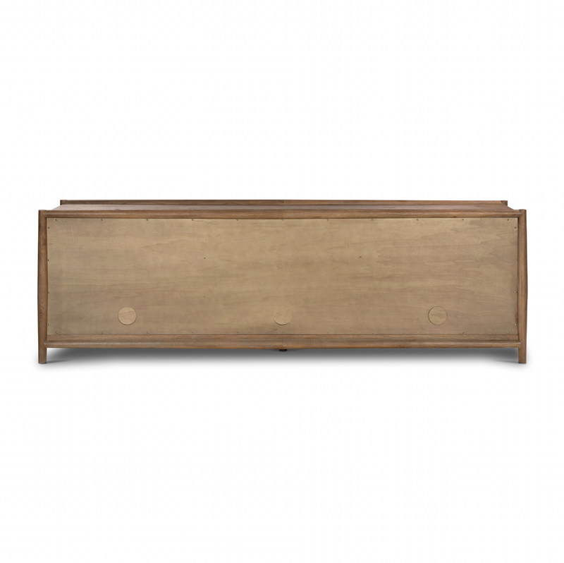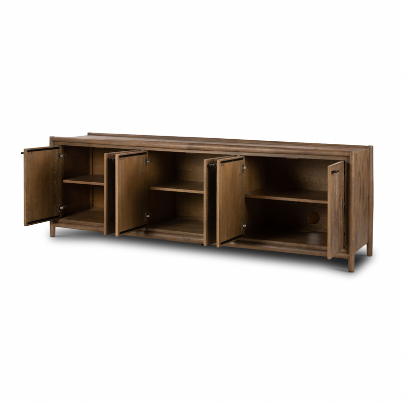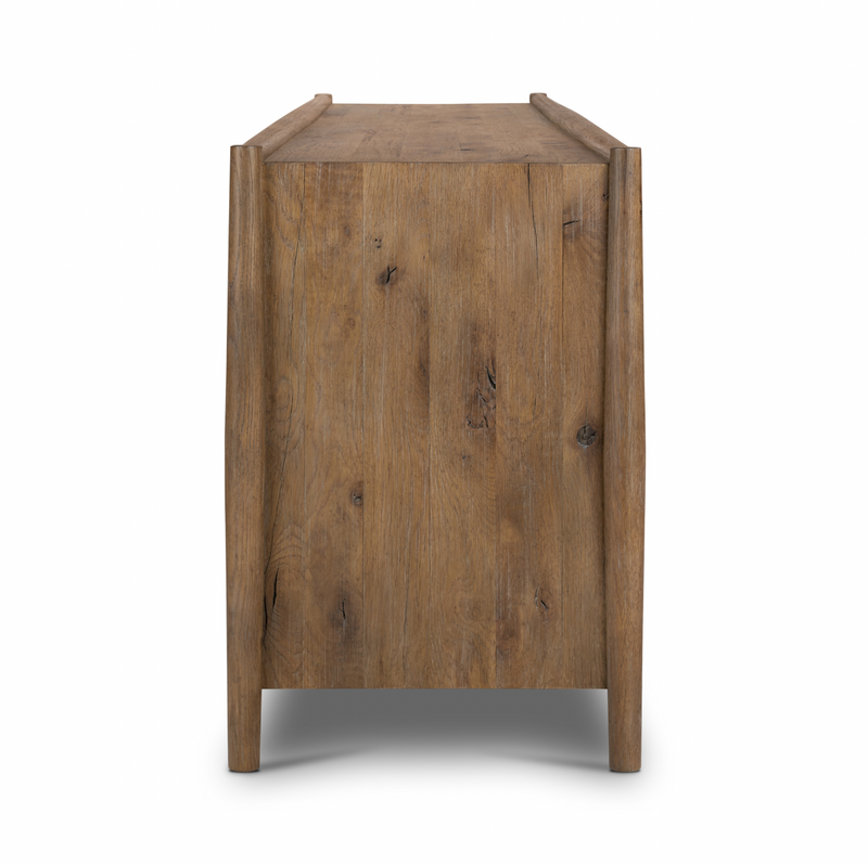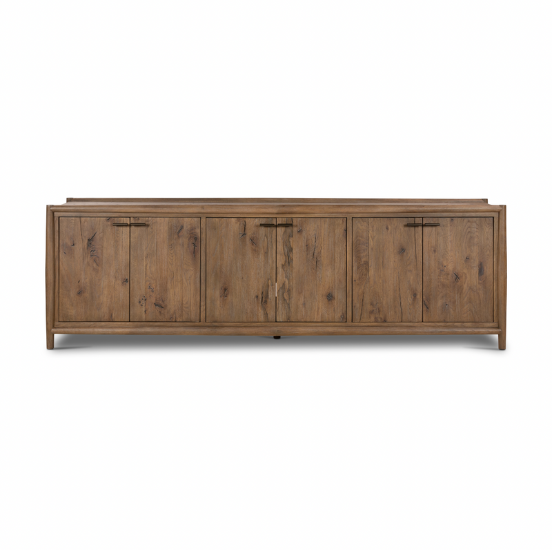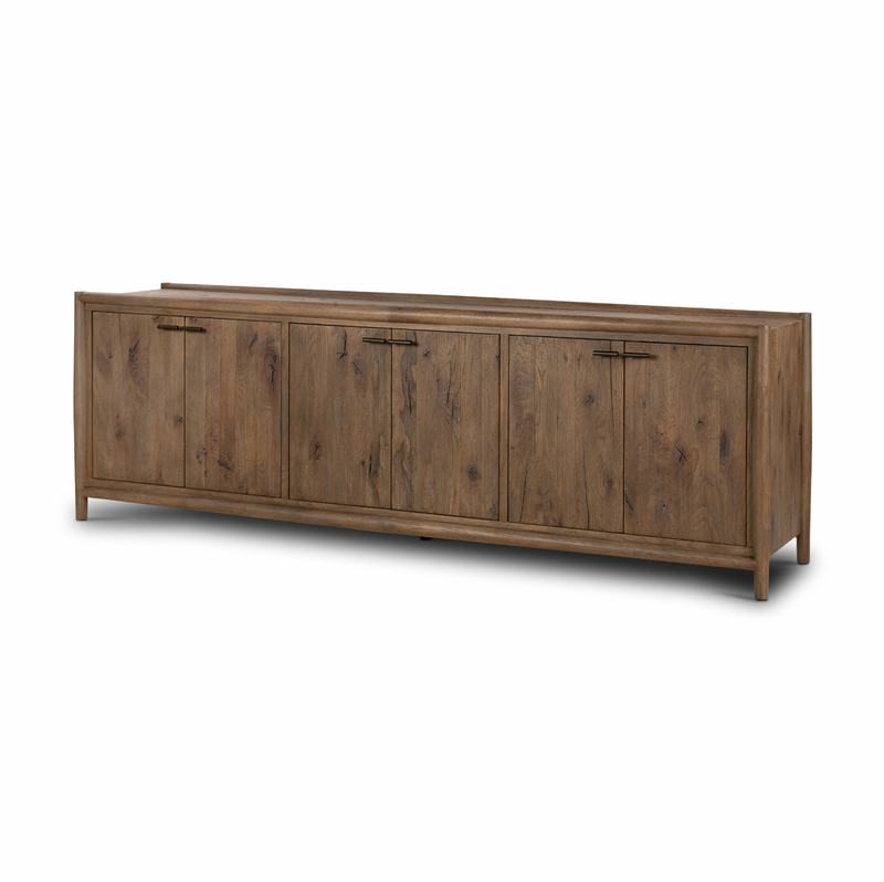 Traditional, reimagined. Made from rustic weathered oak, a six-door sideboard brings generous storage space to the dining room and beyond. Simple cylindrical hardware is finished in an aged bronze.
