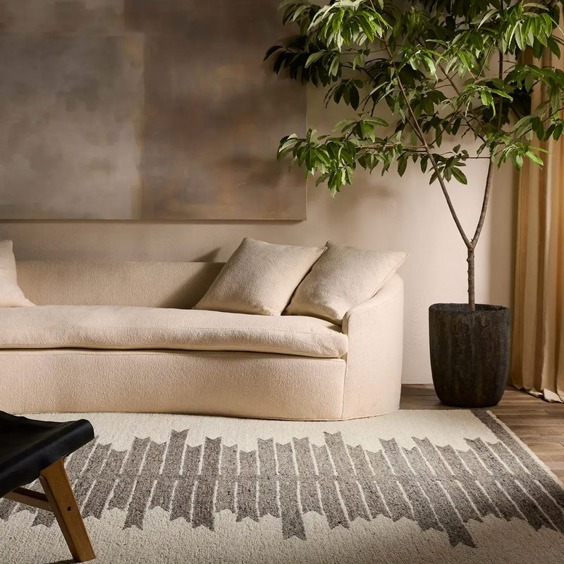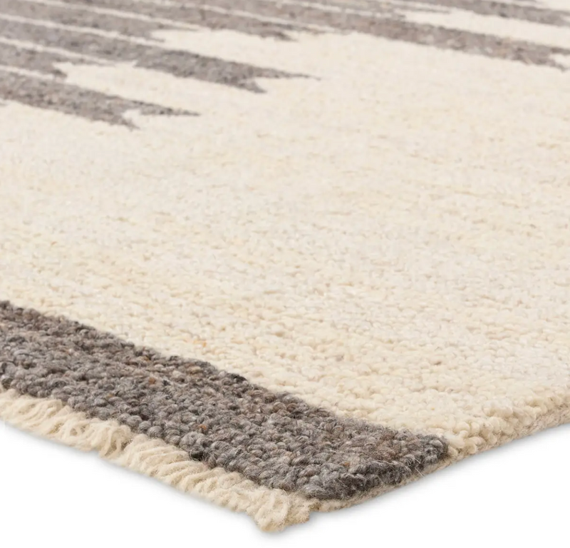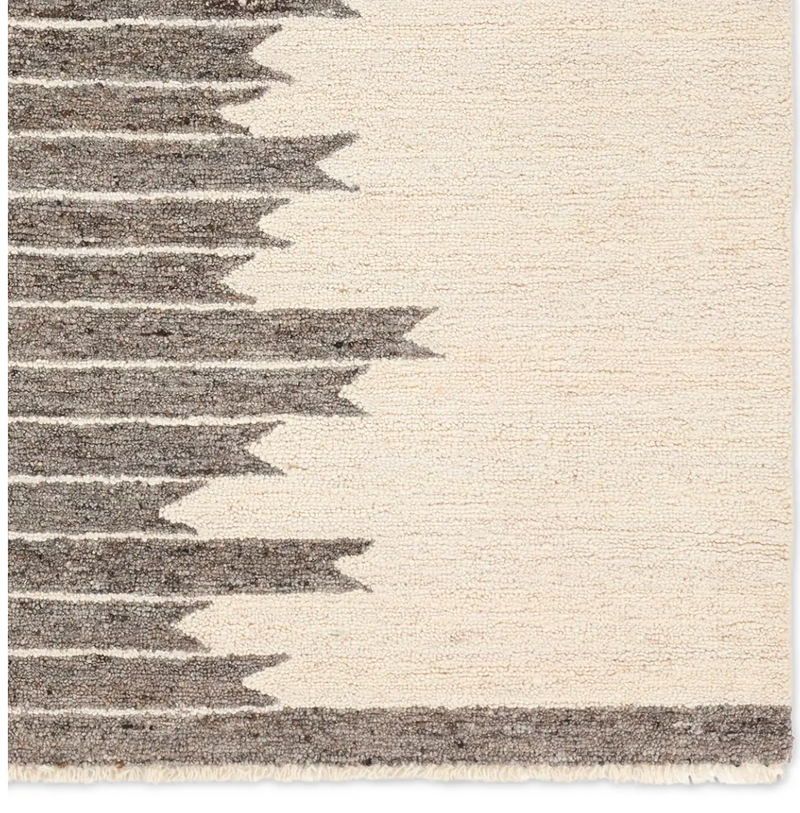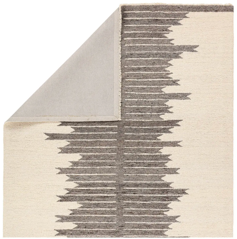 The hand-tufted Hadi collection introduces fresh looks inspired by modern Moroccan patterns and neutral colorways. The Chaima design features a cream background with a center column of darker gray accents. Short, cream fringe and 100% wool pile adds to the global appeal. This rug is naturally stain-resistant and works best in low traffic areas of the home such as bedrooms, formal living rooms, formal dining rooms, and sitting rooms.