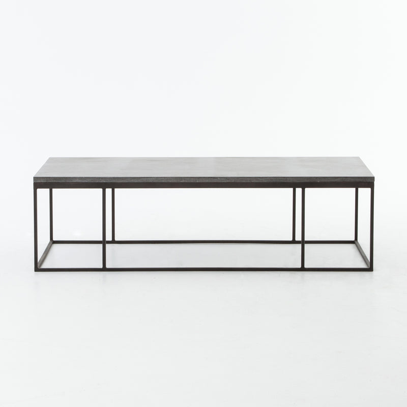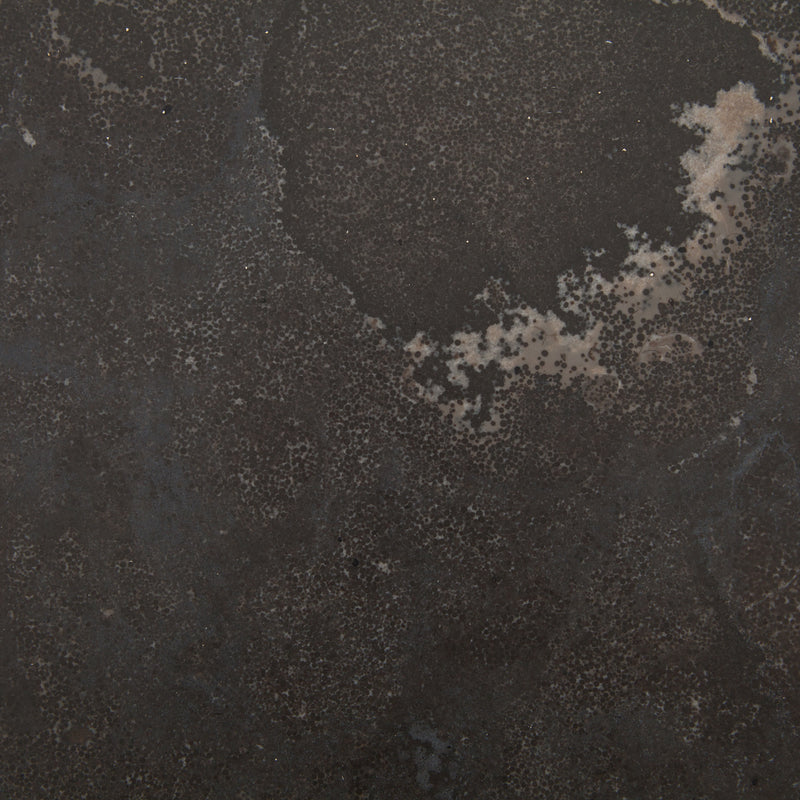 Spare beauty, casual elegance. Finished in a slick gunmetal, a clean Parsons-style base features hand-rubbed, dimensional edging, with a rough-hewn bluestone slab that feels both found and perfectly placed.