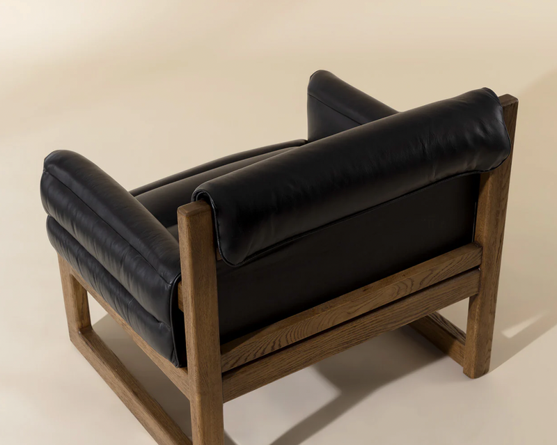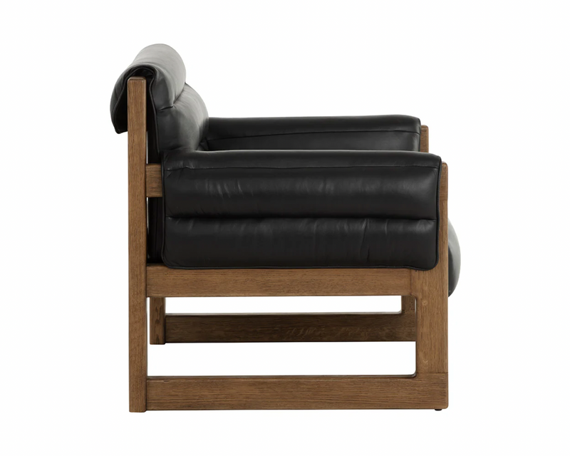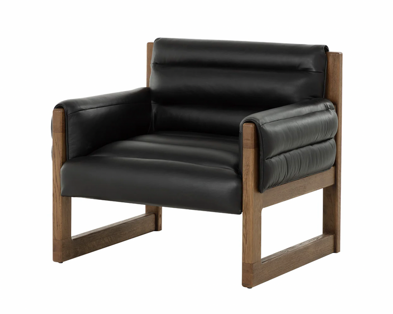 Beautiful and stylish, the Knowles Lounge Chair is sure to impress. Nestled within a warm brown oak wood frame are channel tufted cushions upholstered in vintage black leather, making the most of its lavish yet cozy appearance. Matching channel tufted padding wraps over the armrests to embrace guests in luxurious comfort.