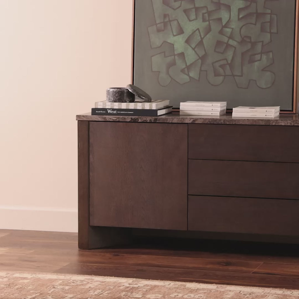 The traditional media console, elevated with mixed materials. Vein-rich marble tops an angular brown oak base, with three drawers flanked by cabinets for storage. Rear cutouts for cord management.