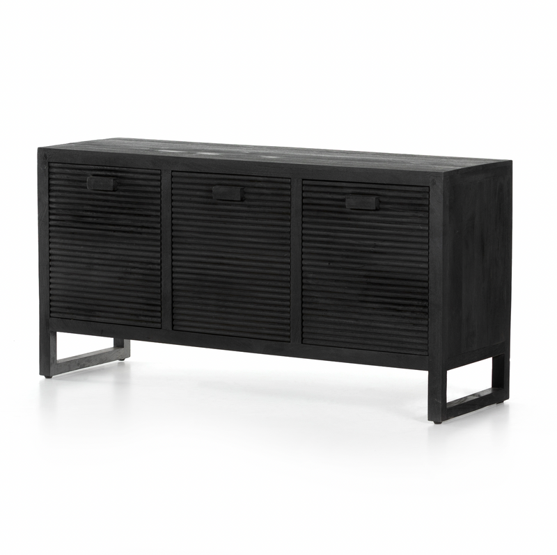 Dark-finished reclaimed woods form a beautifully substantial console, with carved reeding for a linear look. Rear cutouts for cord management.