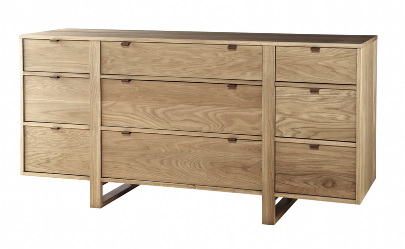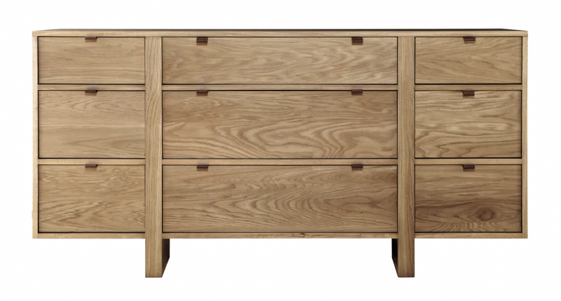 The Lucas Collection is hand-crafted from solid white oak and available in two standard finishes, Sand and Pewter and several other custom stains. The Lucas Dresser features 9 soft-closing drawers and a convenient coin tray; Complete with hand-stitched leather pulls. Bonus - The Lucas Collection is crafted in Canada!