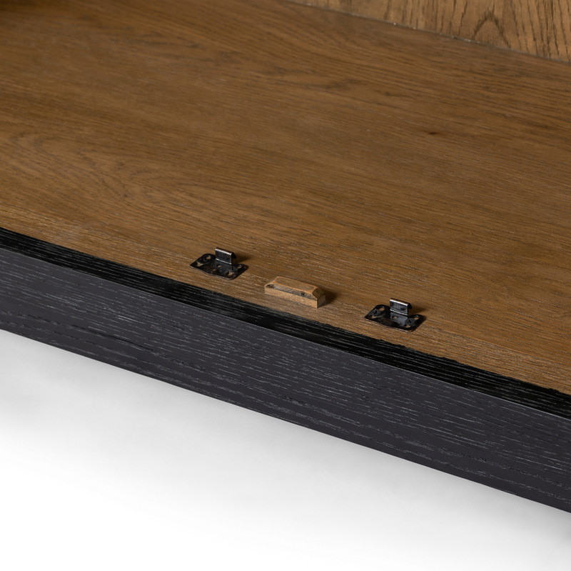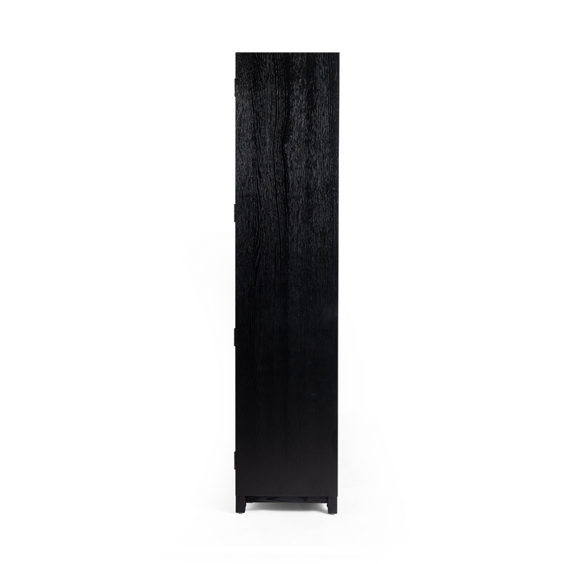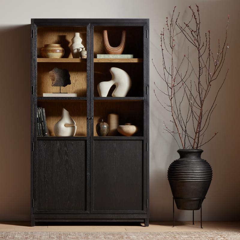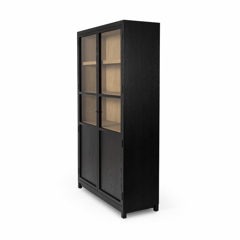 Matte black drifted oak frames lighter interior shelving for subtle but striking contrast. Glass doors allow for prized possessions to dazzle on full display while spacious cabinets add out-of-view storage.