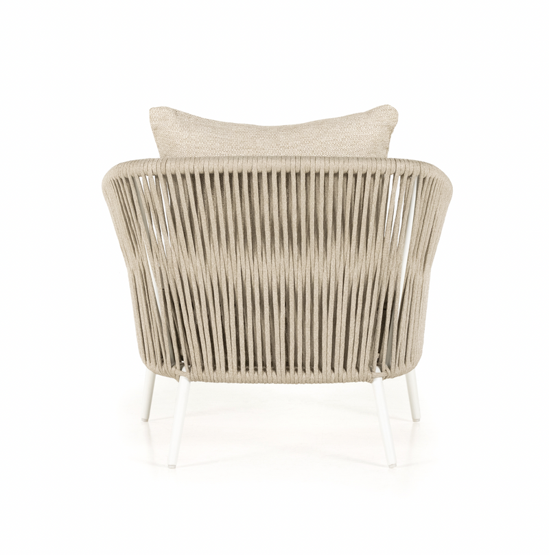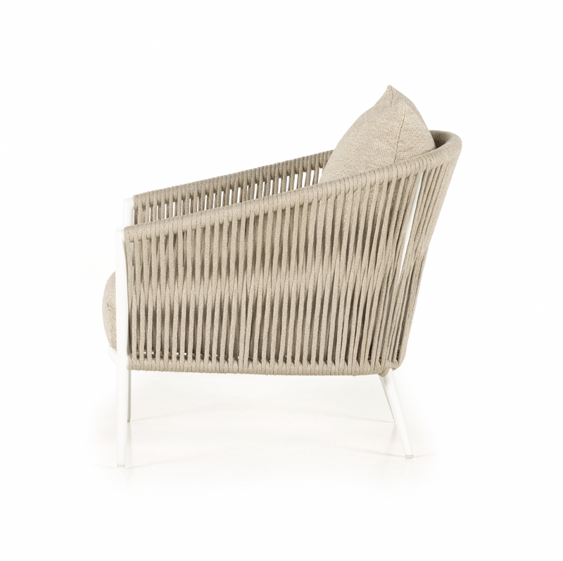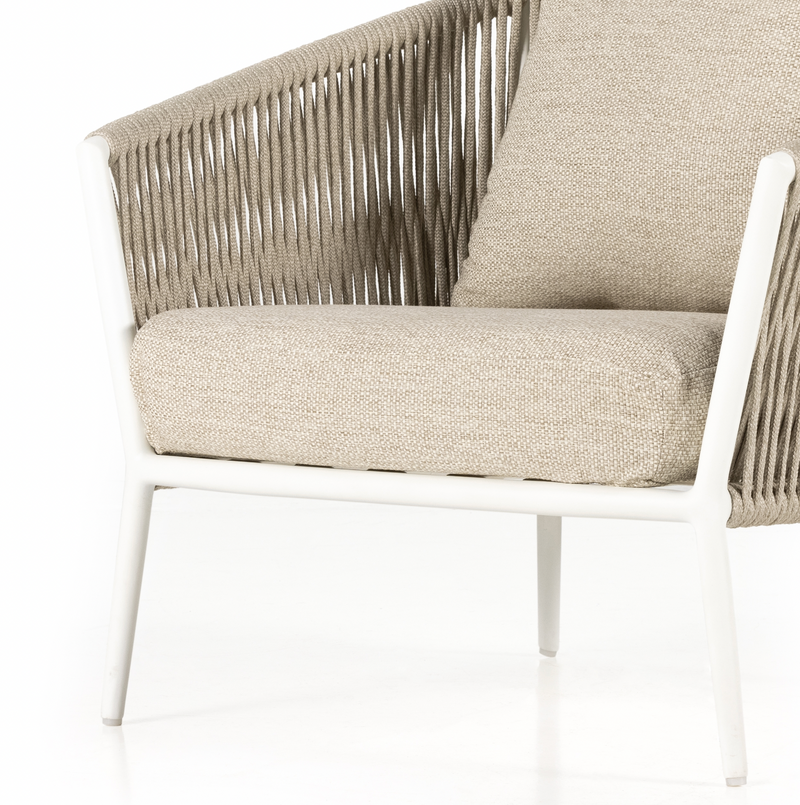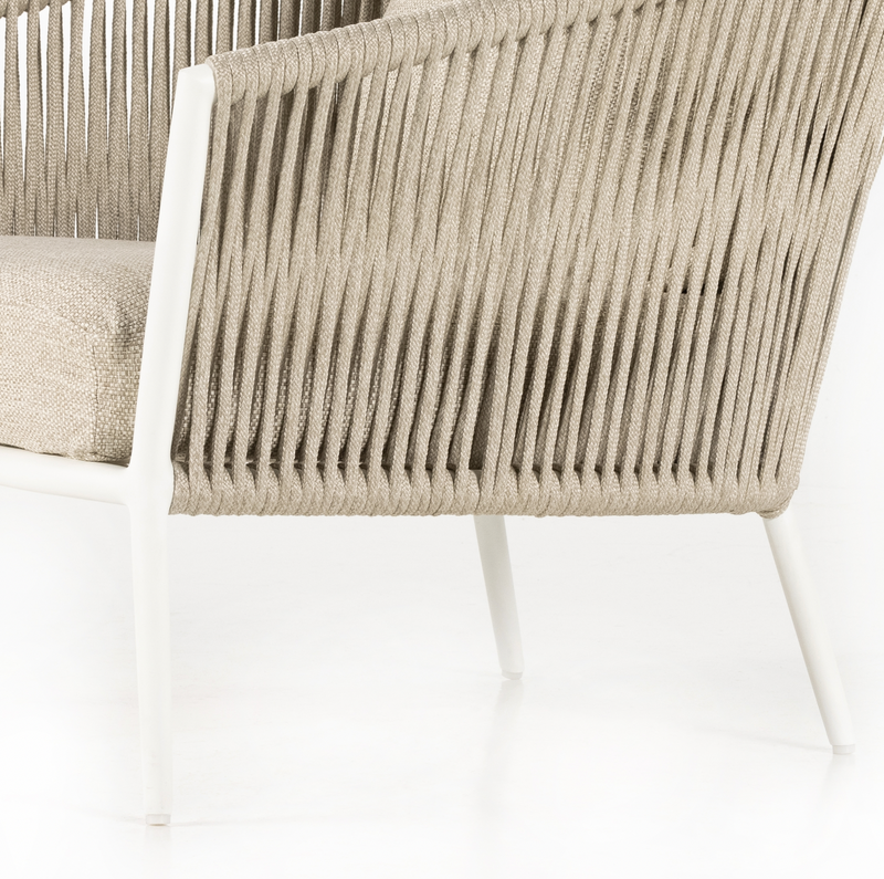 The perfect place for outdoor daydreaming. A beautiful rope-based design is woven across a durable aluminum frame. Topped with a wide cushion and throw pillow, all upholstered in 100% olefin, known for its UV-resistant, water-repellent and quick-drying abilities. Cover or store indoors during inclement weather and when not in use.