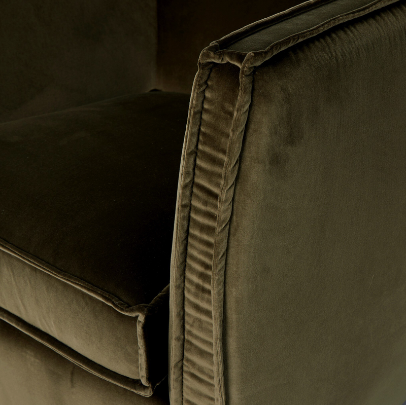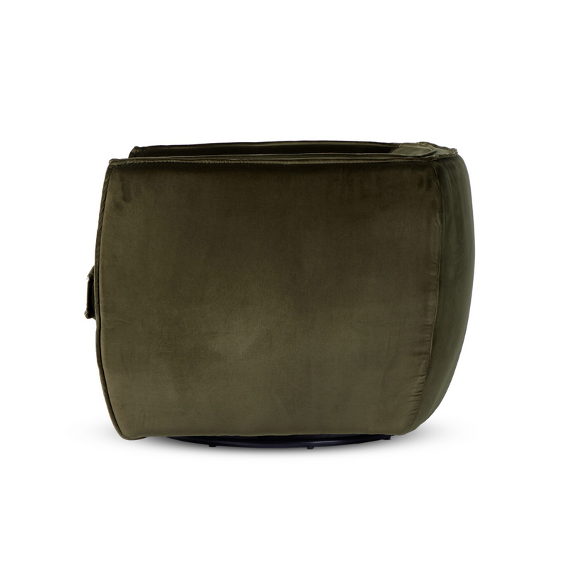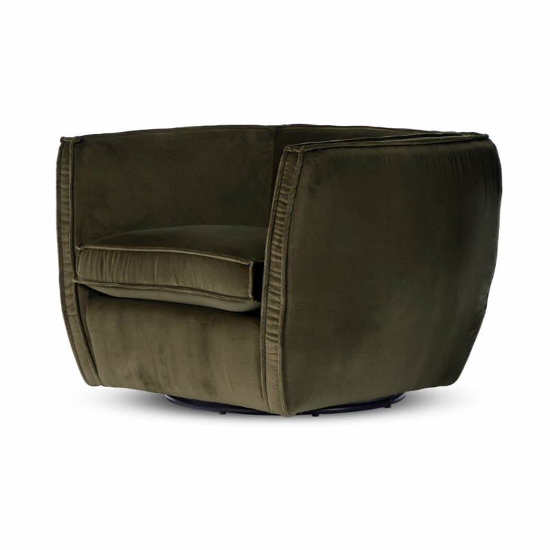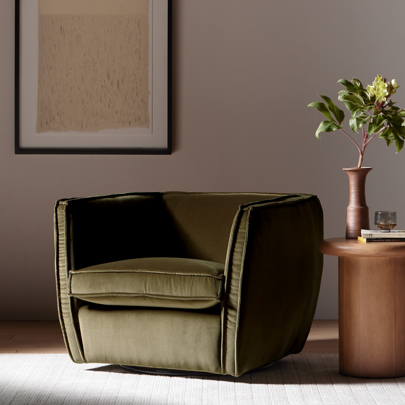 Adorne your space with our stylish accent seating, the Four Hands Rashi Swivel Chair offers a fresh spin on casual decor. Crafted in part from a beautiful olive velvet, this piece embodies modern functionality while adding a touch of contemporary flair to any room. The flange trimming adds a fun and unique detail to the silhouette, enhancing its visual appeal. Plus, with a 360-degree swivel feature, it brings a modern touch to your living space. Whether you're looking to relax in style or entertain guests, this accent seating is sure to impress.