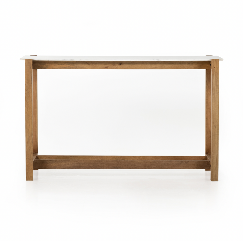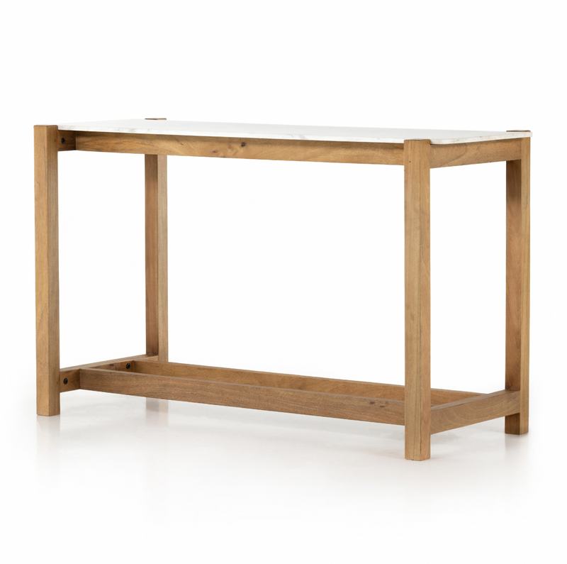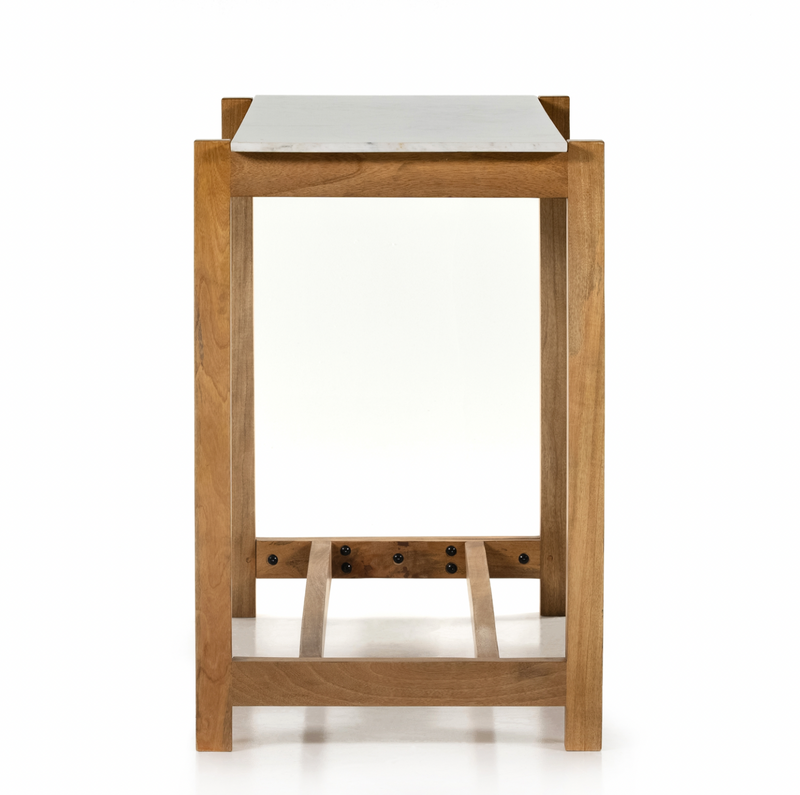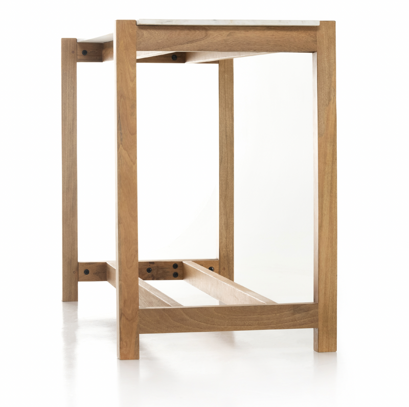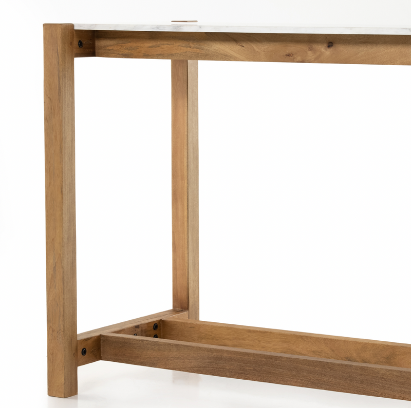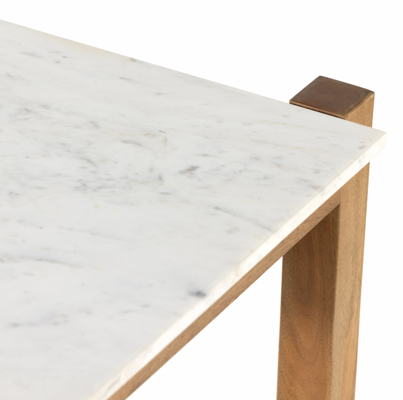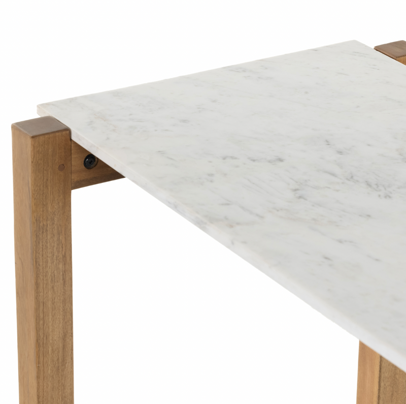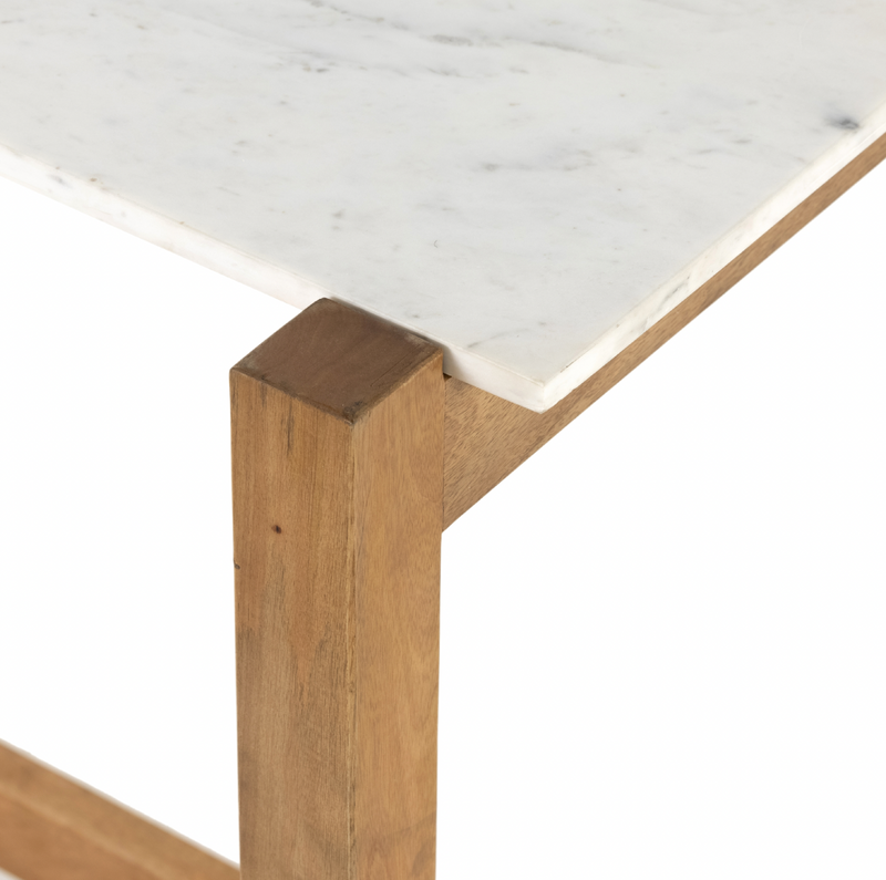 Simple and streamlined, an eye-catching material mix takes this modern table to the next level. Auburn-finished mango forms an open, structured frame for a rectangular tabletop of solid white marble, for a midcentury-infused twist on traditional farmhouse styling.