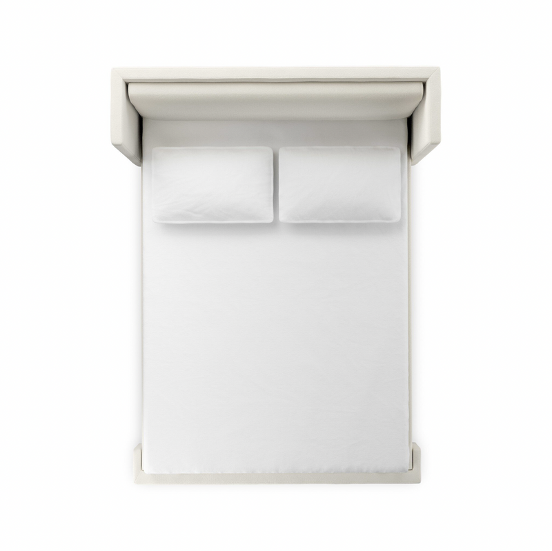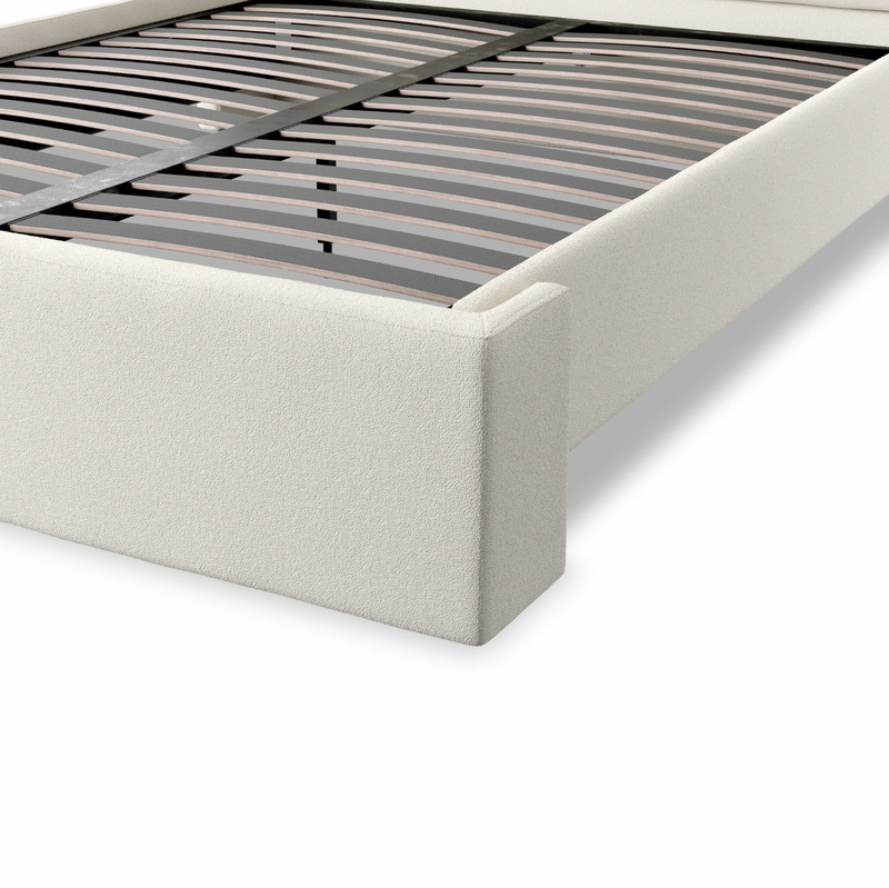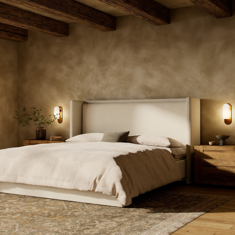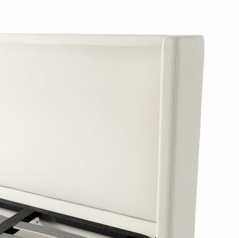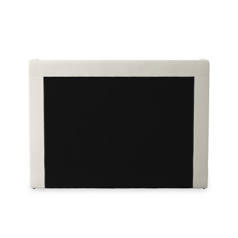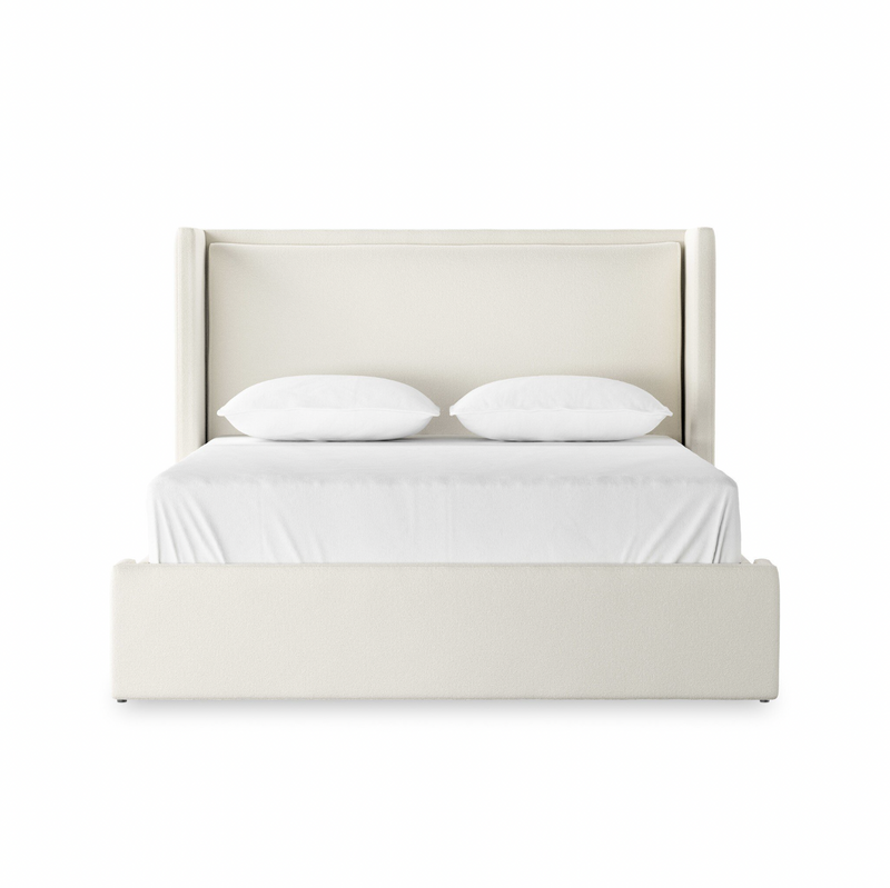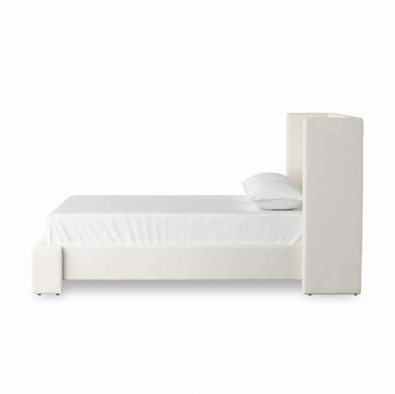 A shorter wingspan and geometric cutouts define this modern-day shelter wingback bed, designed for comfort from every angle. Upholstered in a cream fabric with subtle texture and a soft hand.