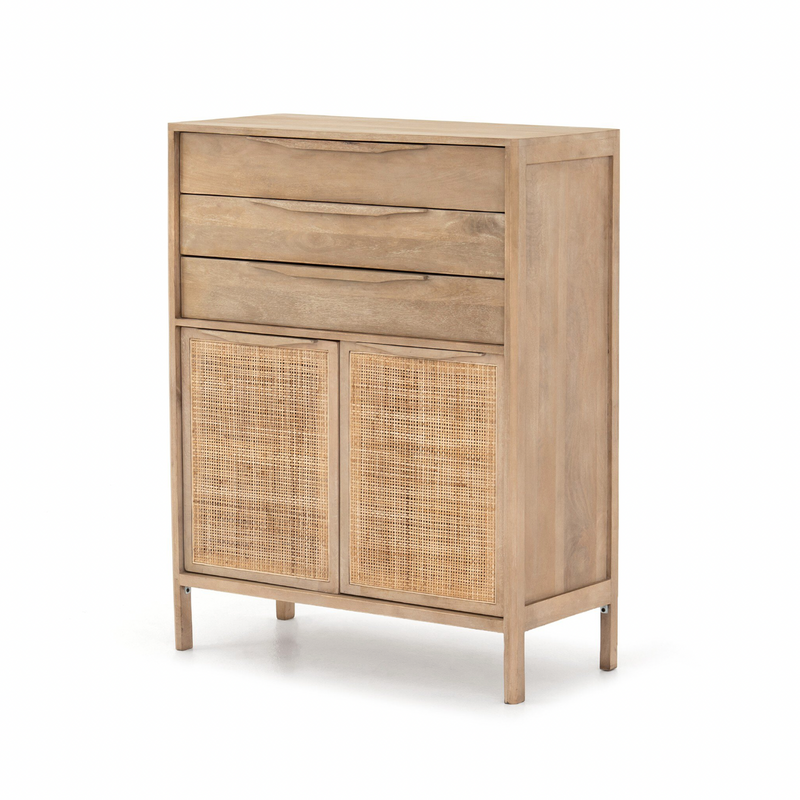 Natural mango framing features front cabinetry of woven cane, for a light, textural look with fresh organic allure. A top trio of drawers brings plenty of storage space to the bedroom.