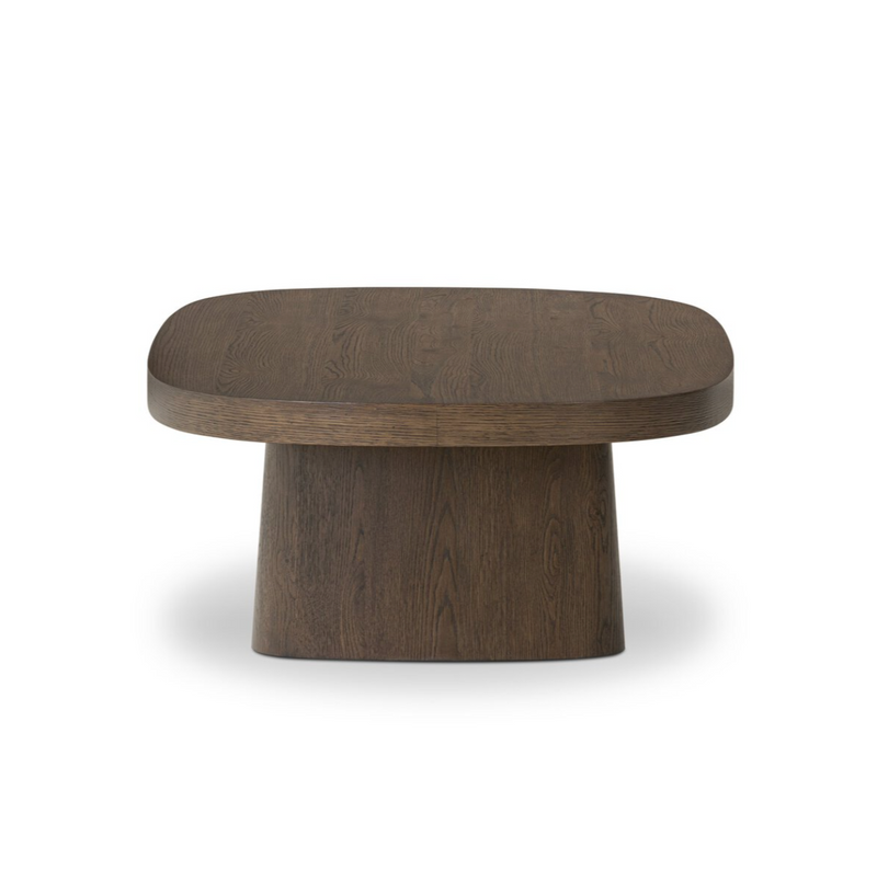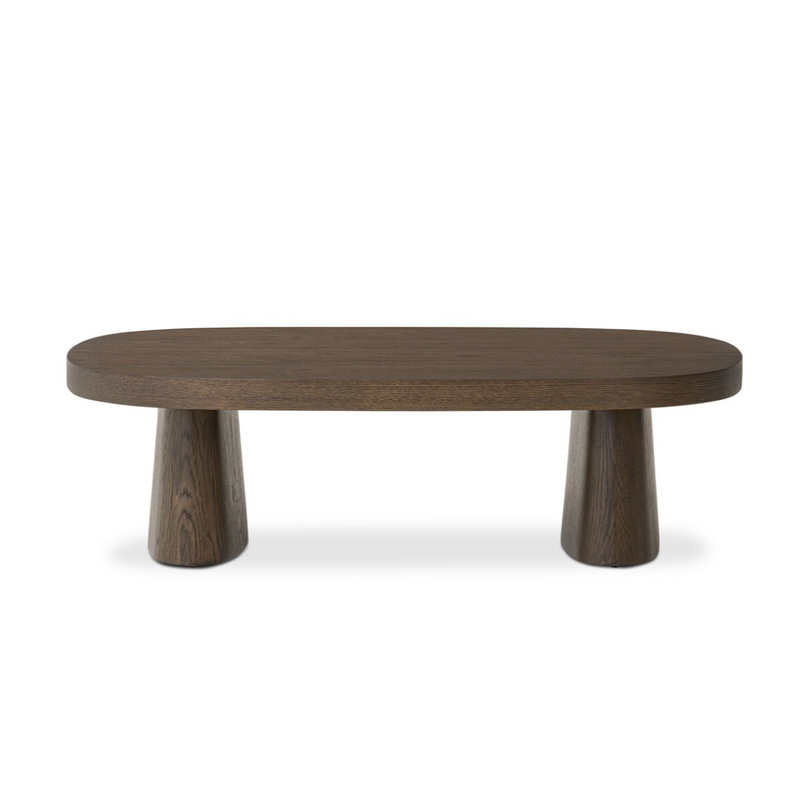 Made from rustic brown oak, this rectangular coffee table is streamlined while not short on presence, with exaggerated cylinder legs and a polished pill-shaped top.